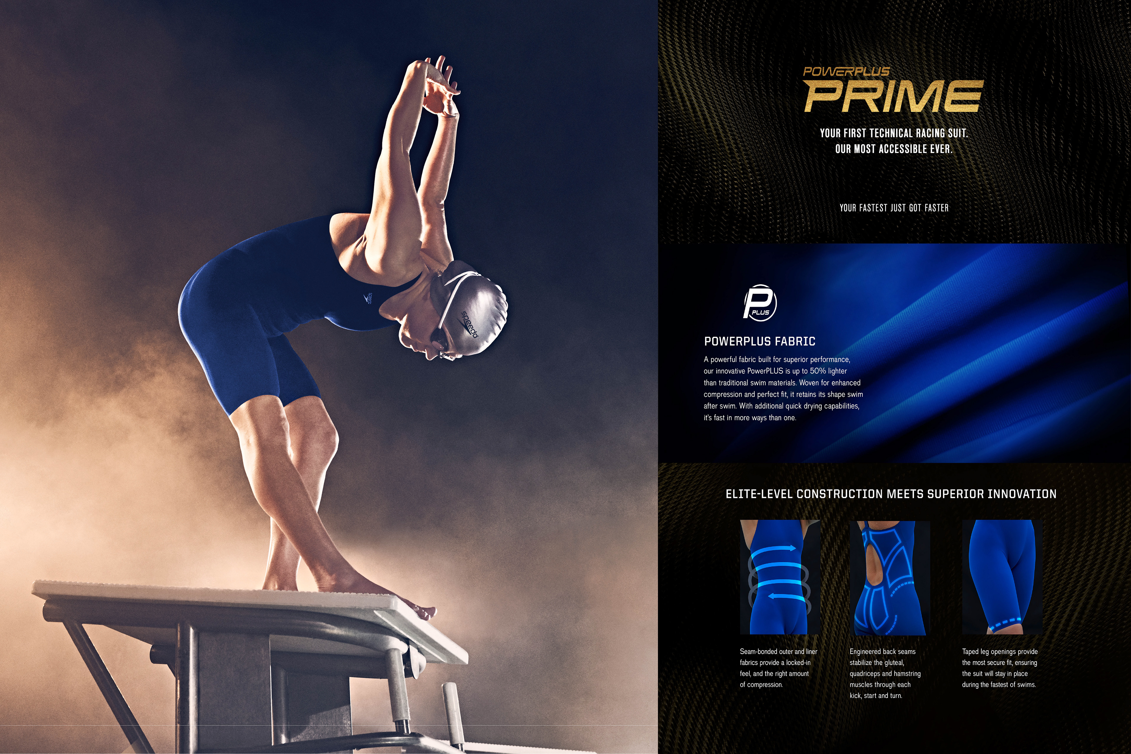 The Speedo PowerPlus PRIME, a FINA-approved knit suit with a distinct carbon fiber resemblance under a hyper macro lens, is the pinnacle of performance swim suits to entry level swimmers. Drawing inspiration from the material and the flexibility the athlete posses in the suit, our campaign showcases the fusion of cutting-edge technology and youthful energy.